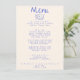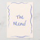 Um menu janto de casamento de vintage retro funky, azul e creme. Que apresenta modelo design de chic de fundo leitoso cremoso e tipografia escrita à mão azul. Com faca e garfo desenhados à mão e uma placa com uma armação branca desenhada à mão no dorso. Perfeito e compatível com toda a suíte.