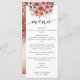 Aprecie seus hóspedes com este cartão de menu refinado em espanhol. Também disponível em inglês. Design coordenando nossos convites para eventos Dourados Rosa. Separe o design que apresenta no topo um arranjo floral único, cor-de-rosa pincelado, cor-de-rosa pincel e champanhe e no fundo o(s) seu(s) nome(s) e data. Detalhes da tipografia de Script manuscrito. De volta em um padrão brilhante rosa dourado e buquê floral no topo.