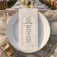 Elevate your black-tie reception tablescapes with this sophisticated design featuring simulated relief details and timeless typography for a luxurious finish.This formal design centers on an elaborate, symmetrical baroque frame featuring scrolling flourishes and intricate floral relief motifs in soft gray. At the header, a decorative oval border encases a regal crest adorned with mirrored bird figures, set against a monochrome ivory and cream background. The text layout utilizes classic serif typography with small caps headers and delicate handwritten script accents to convey traditional romance. This is a flat printed image with a Faux Letterpress effect, not actual raised paper or embossed material.