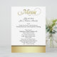 Menus elegantes da mesa da recepção de casamento feitos no branco, com uma banda do ouro e do preto, na coberta dianteira e goldtone inferior a parte traseira do menu. O menu no texto gráfico extravagante goldtone do roteiro, decora a parte superior do menu. Todo o resto do texto preto está pronto para personalizar para sua recepção de casamento. Produtos de harmonização do casamento disponíveis.
