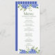 Este menu de festa de noivado chic e elegante, azul de hydrangea é perfeito para suas mesas na sua festa de noivado. Tem seções para o primeiro curso, segundo curso, 3 opções de entrada e sobremesa. Os modelos são muito fáceis de usar, então, fazer que este seu seja só um minuto ou dois. Definitivamente coloque um em cada lugar em seu partido para que seus hóspedes saibam as opções de comida incríveis que você disponibilizou para eles e para que eles possam solicitar suas escolhas sem esforço à medida que o serviço de janto progride.