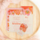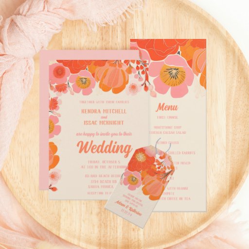 Lindos menus de casamento floral feminino com flores de papoila rosa coral.