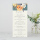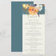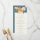 Elementos: flores ousadas em um fundo azul-turquesa. Seus nomes e detalhes são emoldurados em um tom creme clássico. Cores: azul-turquesa, verde, azul-marinho, creme, terracota, laranja, dourado, azul poeirento. Temas: neutros frescos, clássico, contemporâneo, boho, boêmio, botânico, jardim. Coleção: Coleção de Casamento Floral Boho Elegante Azul-Turquesa Terracota. Tipo de Produto: Cardápio