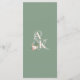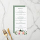Um cartão de menu chic e moderno para melhorar sua configuração de lugar. Este design apresenta rosas brancas e eucalipto com elementos florais cor-de-rosa e cor-de-pêssego. Dê aos seus hóspedes todas as informações necessárias em uma fonte serif limpa. A parte de trás apresenta o seu monograma com uma cor de cheio, um fundo verde de sábio rico.