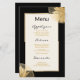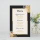 Um elegante, porém moderno, design com suculentos luminosos de folha de ouro falsos em cantos opostos deste cardápio de casamento. Um fundo azul empoeirado.