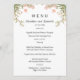 Um arranjo floral romântico de flores silvestres macio e verduras e salgado enfeitam os cantos deste elegante menu de tipografia. Adicione seus nomes, data e janto de casamento ou detalhes do brunch usando o modelo. Perfeito para qualquer casamento ou celebração temático ao ar livre ou jardim, esta delicada design é incorporada a um pacote completo de artigos de papel para um tema perfeitamente coordenado. A parte de trás do menu tem uma cor rosa coordenada.