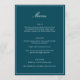This formal wedding menu card features an elegant script heading, clean serif typography, and a classic border on a deep teal background for a timeless reception look. The structured layout presents each course clearly while adding a refined, cohesive touch to table settings or place settings. Designed to coordinate seamlessly with classic and black-tie wedding stationery, it elevates the overall tablescape without feeling busy. Ideal for couples who want reception details that feel polished, organized, and enduring.