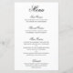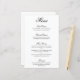 Menu de casamento elegante e clássico, com um simples design com "menu" e os cabeçalhos do curso em uma caligrafia negra formal e descrições do curso em uma fonte serif sobre um fundo branco. Um design tradicional e clássico que é perfeito para um casamento de gravata negra. Esses menus baratos de casamento são impressos em folhas de papel para uma opção econômica.