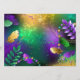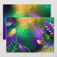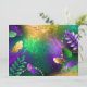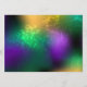 Fundo de grãos de cereais, iridescentes, textualmente, com manchas roxas, amarelas e verdes, decoradas com penas e miçangas brilhantes. feriado Mardi Gras.