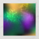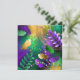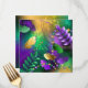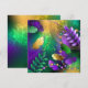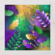 Fundo de grãos de cereais, iridescentes, textualmente, com manchas roxas, amarelas e verdes, decoradas com penas e miçangas brilhantes. feriado Mardi Gras.