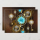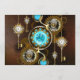 Lentes de turquesa com relógio antigo com engrenagens de latão e chaves de ouro sobre fundo enferrujado e marrom. Estilo Steampunk.
