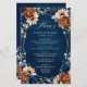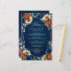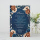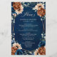 Elegante azul-Marinho, Terracotta, menu de casamento do tema floral da Terra Laranja com buquê elegante de azul-Marinho, rosas de cor Terracotta e folhas verdes de eucalipto. Entre em contato comigo para obter ajuda sobre a personalização ou se você precisar de outro produto com este design.