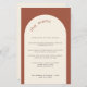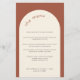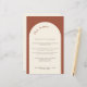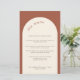 Este cardápio moderno de casamento com a letra minimalista é perfeito para um casamento moderno, casamento mínimo ou qualquer outra celebração. Este modelo de menu apresenta um fundo de terracota e um arco em branco creme. Todos os elementos de texto e cores deste cartão de menu de casamento podem ser personalizados.