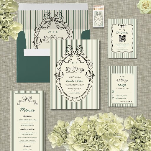 This hand-drawn bow wedding menu features slim green stripes, a sketched ribbon header, and a refined vintage layout with a nostalgic preppy feel. The subtle retro detailing and heritage-inspired typography create a quiet luxury aesthetic, perfectly coordinating with the vintage swan wedding suite for a cohesive editorial look.