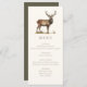 Cartão de menu de jantar com tema de caça com ilustração de cervo e tipografia elegante, verso verde oliva escuro e texto personalizado. Perfeito para um jantar campestre, jantar de ensaio de casamento elegante, jantar de caça, festa de aposentadoria de caça ou festa de aniversário de caça.