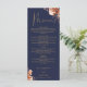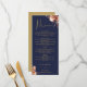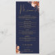 Este menu de casamento floral rústico elegante pode ser personalizado com suas informações em tipografia dourada sofisticada em um fundo azul-marinho. Projetado por Thisisnotme©