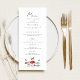 Cartão de menu de janto de casamento russo com ilustração aquosa de cogumelos e mariposas.