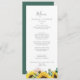 Este cartão de janto de casamento de girassol rústico é perfeito para um casamento country. O design floral boêmico apresenta girassóis amarelos, flores cor-de-rosa pinceladas e verde-caçador de eucalipto verde em aquarela com um elegante e moderno sentimento de bolho. Este menu pode ser usado para recepção de casamento, janto de ensaio ou qualquer evento.