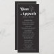 Estes menus de janto de casamento de 4 x 9", estilo de safra, apresentam uma inscrição branca com um título estilizado, "Bon Appetit", em letras grandes brancas, com um sotaque cardíaco em fundo preto. O menu tem espaços reservados para 2 aperitivos, 2 entradas e 2 sobremesas e os nomes dos casais de casamento. Cores hexadecimais, branco-fbfb e preto-231f20.