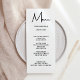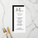 Este moderno cartão de menus minimalista apresenta uma caligrafia ousada e uma fonte simples para o seu menu de casamento sobre fundo branco na frente e um backer preto sólido. Perfeito para um casamento moderno, mas clássico, ou outro evento, casamento com um tema preto e branco ou casamento elegante. No verso está espaço para seus nomes e data de casamento - ou simplesmente apague o texto no verso. Este item faz parte de uma coleção de casamento inteira com mais itens correspondentes.