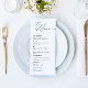 Precisa de um cartão de menu clássico e minimalista do janto Casamento? Nosso design apresenta a tipografia moderna do script e espaço suficiente para suas opções de menu.