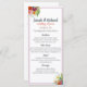 Celebre seu dia especial com este encantador menu janto de casamento de flor silvestre e aquática. Apresentando flores vibrantes de primavera jardim e uma abertura macia de aquarela no fundo, este elegante layout vertical exibe lindamente seus aperitivos, prato principal, sobremesas e bebidas. Perfeito para casamentos ao ar livre, vinhedo, jardim ou rústicos, este design de cardápio combina facilmente com nossos convites de casamento, cartões RSVP, cartazes e outros artigos de papelaria. Personalize com seus próprios detalhes de menu e data de casamento para adicionar um toque elegante e coeso às suas mesas de recepção. Ideal para jantas sentados, recepções de coquetéis e comemorações do estilo buffet. Um eterno que os convidados adorarão!