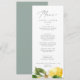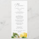 Este moderno cartão de janto de casamento do limão-jardim é perfeito para um casamento de primavera ou verão. O design mediterrânico rústico apresenta limões aquosos brilhantes e bonitos com flores brancas boêmicas e folhas verdes elegantes. Este menu pode ser usado para recepção de casamento, janto de ensaio ou qualquer evento.