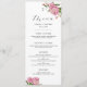 Cartão de menu de janto floral elegante, com a ilustração aquosa de flores cor rosa de pénia rosa com verde.