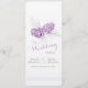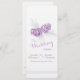 Menu de recepção de casamento de desenho de um cone de pinho moderno, de dois lados, jantado em lavandas roxas bonito e cinzas em branco. Ideal para as suas mesas de jantar rústicas ou casamentos no inverno ou para dar antes do casamento. Personalize seus próprios nomes e seus detalhes do menu de quatro cursos ao contrário. Desenho de lápis e design exclusivo de Sarah Trett.