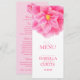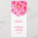 Menu de janto de recepção de casamento de cor d'água floral da camélia de dois lados, a rosa, sobre fundo branco. Se precisar de ajuda para ajustar os seus cursos neste menu, por favor contacte-me. © Impressão original da camélia e design por Sarah Trett. www.sarahtrett.com para www.mylittleedenweddings.com