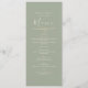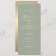 Este cartão de cardápio simples e elegante apresenta um fundo verde de sábio macio, fontes serif refinadas e um delicado divididor de coração de ouro para um toque romântico. Ideal para temas de casamento minimalistas ou botânicos, ele lista entradas, entradas e sobremesas em um formato alto perfeito para colocar no assento de cada convidado. Totalmente personalizável com o menu e os nomes do seu casamento, esta design complementa lindamente os estilos de jardim, ao ar livre ou de celebração terrestre.