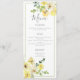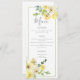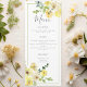 Delicar as flores amarelas da aquarela decoram este adorável menu de janto de casamento de verão. O papel de carta de casamento do jardim é acentuado com uma delicada faixa verde retangular verde e folhas botânicas debaixo dos elegantes e ensolarados. Floral e leve, perfeito para uma cerimônia ao ar livre.