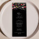 Este janto de flores silvestres multicolores do jardim é perfeito para um casamento rústico. O design apresenta uma variedade multicolorido de flores silvestres cor-de-rosa, pinceladas, roxas, amarelas, brancas, violetas, vermelhas e burgundy em fundo preto. Este menu pode ser usado para recepção de casamento, janto de ensaio, chá de panela ou qualquer evento.