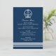 O cartão de cardápio de janto náutico moderno e pré-desidratado apresenta um monograma de casamento exibido dentro a âncora de barco com corda pontilhada e detalhes de faixa. Marinho azul, cinza clara/prata e esquema de cor branca.