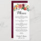 Design do cartão de menu de casamento Menu em roteiro com texto personalizado e um monograma que pode ser completamente personalizado, enquadrado por um verão rústico e cair no design de aquarela floral com belos rosas, dahlias, flores de pénia, e verde, em uma bela paleta de outono de vermelho arrojado, amarelo ouro, laranja cor de pêssego, rosa pincel e tons de verde. Uma cor vermelha de fundo entorpecida com uma aparência texturizada veste-se na parte de trás do cartão.