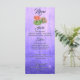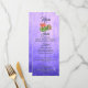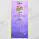 Um cacto florescente laranja num fundo roxo rústico e um cardápio de casamento de luzes de fadas.
