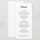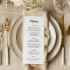 Este cartão de cardápio de casamento faz uma declaração com seu roteiro moderno e ousado. O esquema de cores preto e branco cria um aspecto impressionante e sofisticado, enquanto o layout claro garante que seus hóspedes possam desfrutar facilmente dos cursos curados planejados para seu dia especial.
