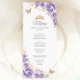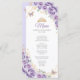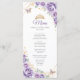 Lilac roxo, ouro e cartão de cardápio fino para celebração de Quinceanera branca. Recursos, fontes de script, borboletas douradas, rosas de aquarela e tiara. Perfeito para uma elegante celebração de glam estilo princesa. Personalize com seus próprios detalhes.