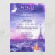 From the Amour Éternel à la Parisienne collection, this double-sided flat menu card brings refined romance to your reception tables. Measuring 5" x 7", the front showcases your menu selections in elegant serif and script fonts, framed by a dreamy watercolor illustration of the Eiffel Tower under a moonlit lavender sky. Parisian rooftops glow softly beneath hues of blush, violet, and twilight blue, setting the tone for a magical evening.