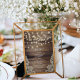 Um tema clássico de casamento com um fundo de madeira rústico, um lugar de vintagem falsa e luzes de cordas. Este menu apresenta uma sobremesa inicial, principal.