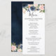 Belo carde cardápio de boho floral apresenta gráficos florais de cor d'água pintados manualmente / rosas em tons ricos de azul marinho e cor-de-rosa / pêssego e estilo encantador de letras de mão. Entre em contato comigo para obter ajuda sobre a personalização ou se você precisar de outro produto com este design.