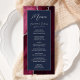 Este elegante e moderno menu de casamento mostra uma coloração d'água baleada sobre fundo, aparada com cintilação de prata. O texto aparece em letras elegantes de cinza prateada e fontes sans serif em um retângulo azul marinho. O design de ágata é repetido no reverso.