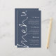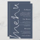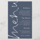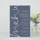 Menu Marinho Azul de Casamento Dusty Script de Orçamento. Um tamanho de preço orçamentário de 5,5" x 8,5", Este design moderno tem Menu em um script de conjunto elegante rodando no lado esquerdo e o resto do texto está alinhado à direita, que você pode personalizar facilmente, assim como seus nomes e data de casamento no verso. As cores do texto e do plano de fundo em ambos os lados podem ser alteradas para qualquer uma de suas opções por meio da opção personalizar mais.