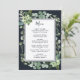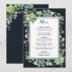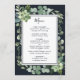 Este menu de casamento apresenta cores d'água suculentas, eucalipto e folhas verdes botânicas com uma estrutura retangular sobre fundo azul de marinho da meia-noite. Itens correspondentes também estão disponíveis.