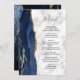 A borda esquerda deste elegante cardápio moderno de casamento apresenta uma marinho azul de aquarela agata bordada com falso brilho dourado. O texto personalizável combina um script de escrita manual dourado e uma fonte de impressão preta em cinza e fundo de mármore branco. O verso apresenta um design azul-marinho e um agate-ouro correspondentes.