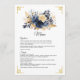 Marinho azul e menu de casamento floral dourado personalizável para suas especificações de evento.