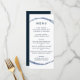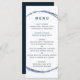 Este menu de casamento apresenta um círculo azul marinho e uma caligrafia simples com fundo branco.