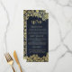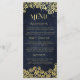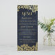 Apresentando um cardápio de casamento marinho azul encantador com um toque de elegância refinada. Adorada com uma tipografia graciosa e intrincadas espirais de ouro, esta design incorpora prazer e sofisticação em perfeita harmonia.