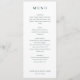Este menu de casamento elegante apresenta um design limpo e minimalista com um layout vertical centrado na palavra "MENU" em fonte serifada maiúscula grande. A paleta de cores é simples e sofisticada, usando texto preto em fundo branco para máxima legibilidade. Cada seção — Entradas, Salada, Prato Principal e Sobremesa — é claramente definida com espaçamento e tipografia consistentes que combinam fontes serifadas clássicas com estilos sans-serif mais simples, criando uma hierarquia visual sutil. Perfeito para eventos formais como casamentos, este design se concentra apenas no conteúdo textual para transmitir clareza e elegância sem quaisquer elementos decorativos adicionais.