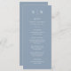Estes elegantes e modernos cartões de cardápio de casamento ou cartões de menu de janto de ensaio apresentam um simples design de texto azul e branco empoeirado que expele o estilo minimalista. Adicione suas iniciais ou monograma para torná-las completamente suas.